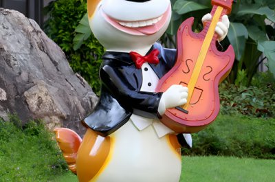 户外园林中的创意雕塑,以动画片中演奏乐器的狗狗为原型,玻璃钢材质保证了其耐久性,同时生动的造型和动作,让人仿佛能听到悦耳的音乐,为园林景观增添了一份艺术气息。