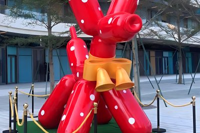 街道路边的玻璃钢美陈摆件,以气球狗为造型,色彩鲜明,形态可爱,为街道增添了一抹生动的色彩。无论是作为城市美化的一部分,还是作为行人的视觉焦点,都能给人们带来愉悦的心情。